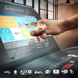 - UNTERHALTUNG: Dank des 15,6 Zoll LCD Touchscreen Display haben Sie alle Trainingsinformationen immer im Blick und können grenzenlose Unterhaltung genießen. Stellen Sie Ihr Smartgerät praktisch vor sich auf der Tablethalterung ab. Die Stereolautsprecher motivieren Sie mit Ihren Lieblingsliedern. WiFi, USB, MP3, Trinkflaschenhalter, Handpulssensoren und 12 vorinstallierte Programme sorgen für noch mehr Spaß und Motivation bei Ihrem Cardiotraining.